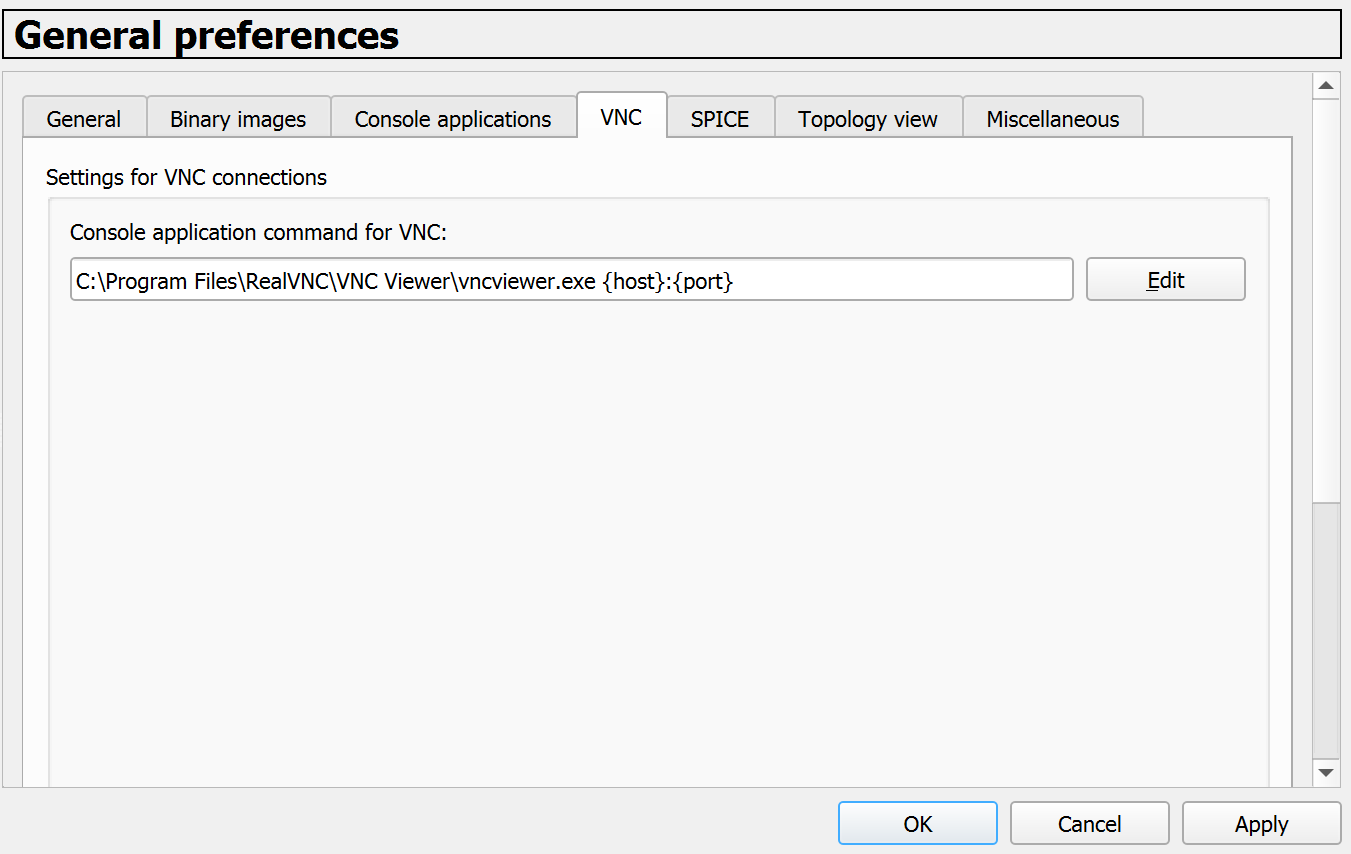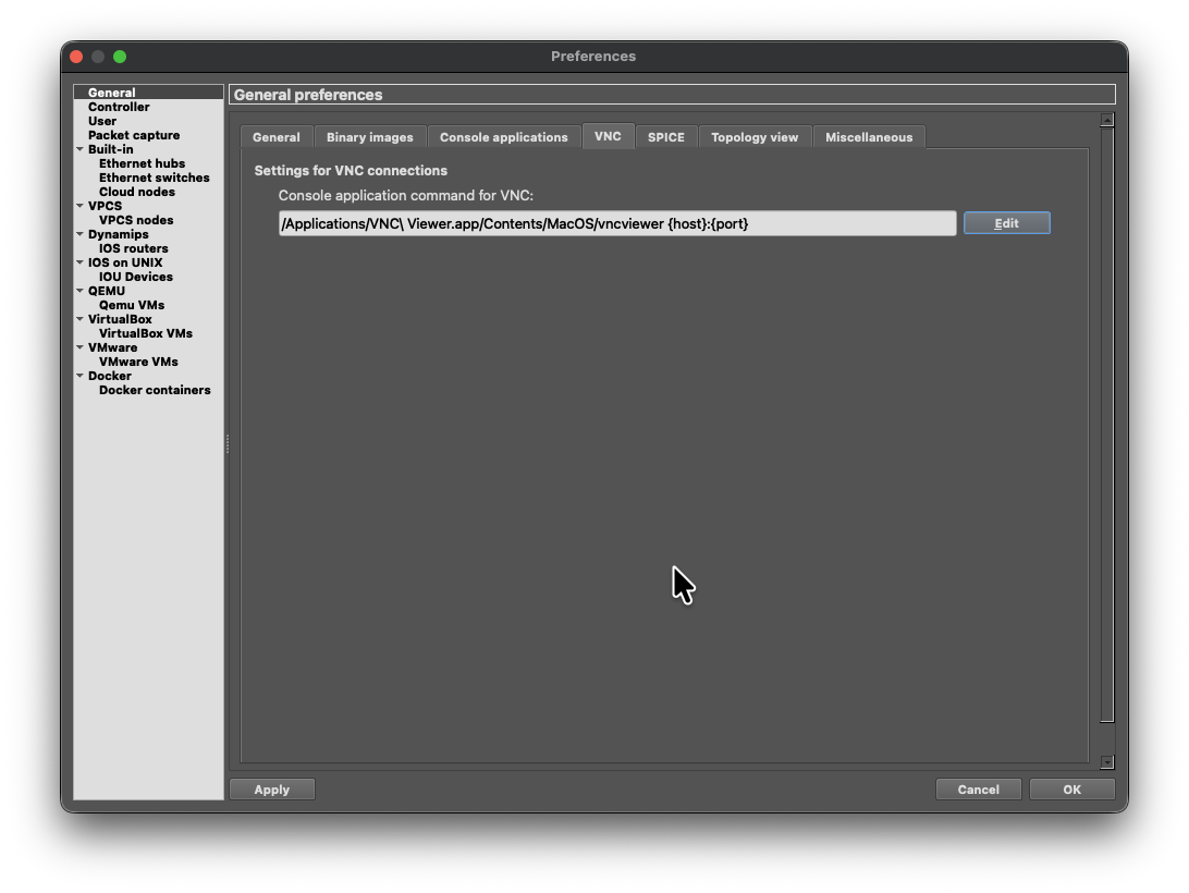 Once installed, Go to GNS3 Preferences → General → VNC and select the custom settings (Edit):