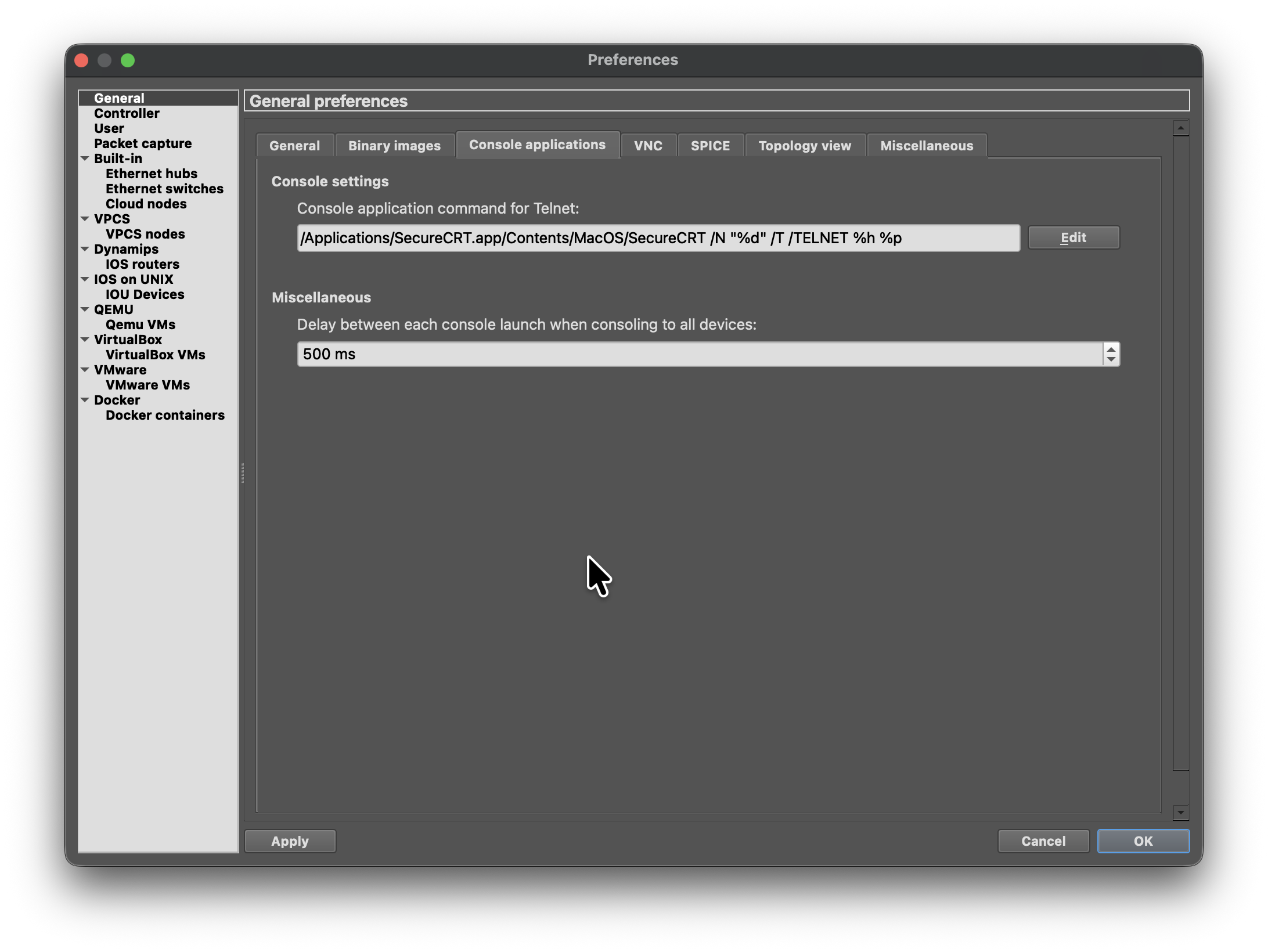 Go to Preferences → General → Console Applications and select the most appropriate application for your machine. In the following example on a Mac with OSX, the Secure CRT application is selected.